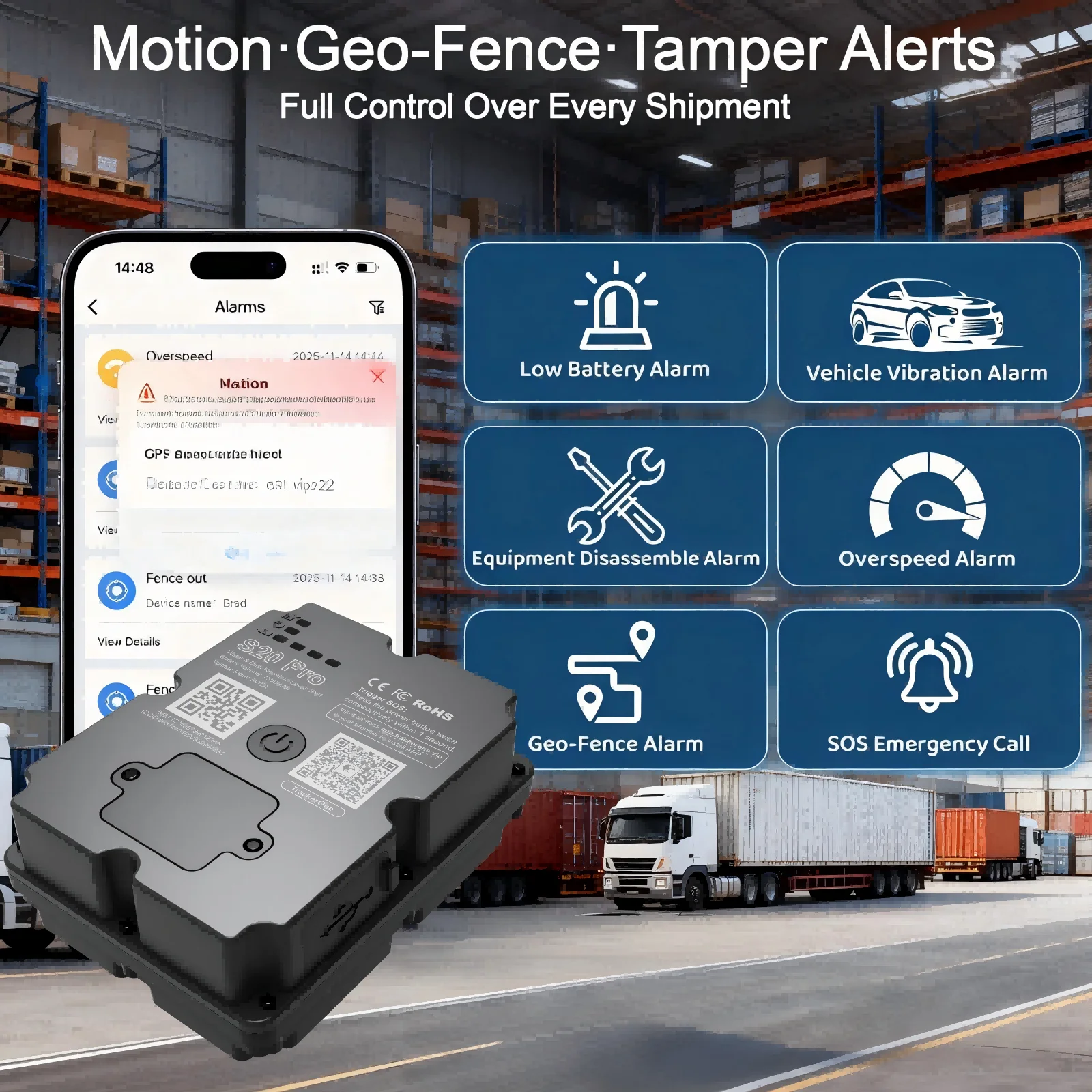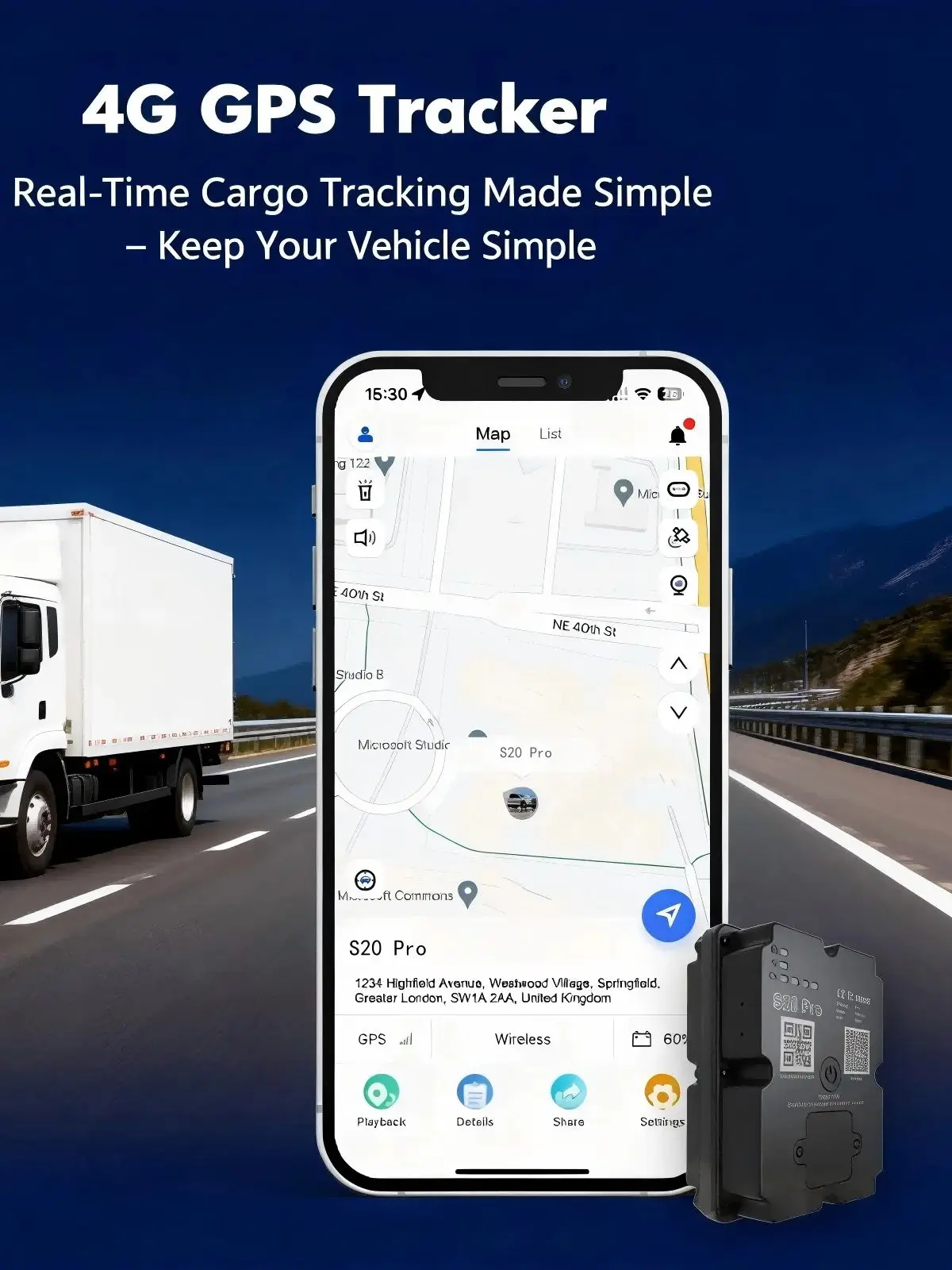 S20 Pro GPS Tracker helps you monitor cargo, shipments, and transport assets in real time — without complex installation or fixed systems.